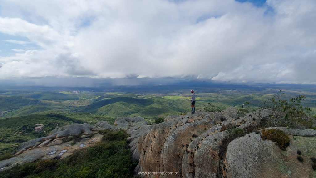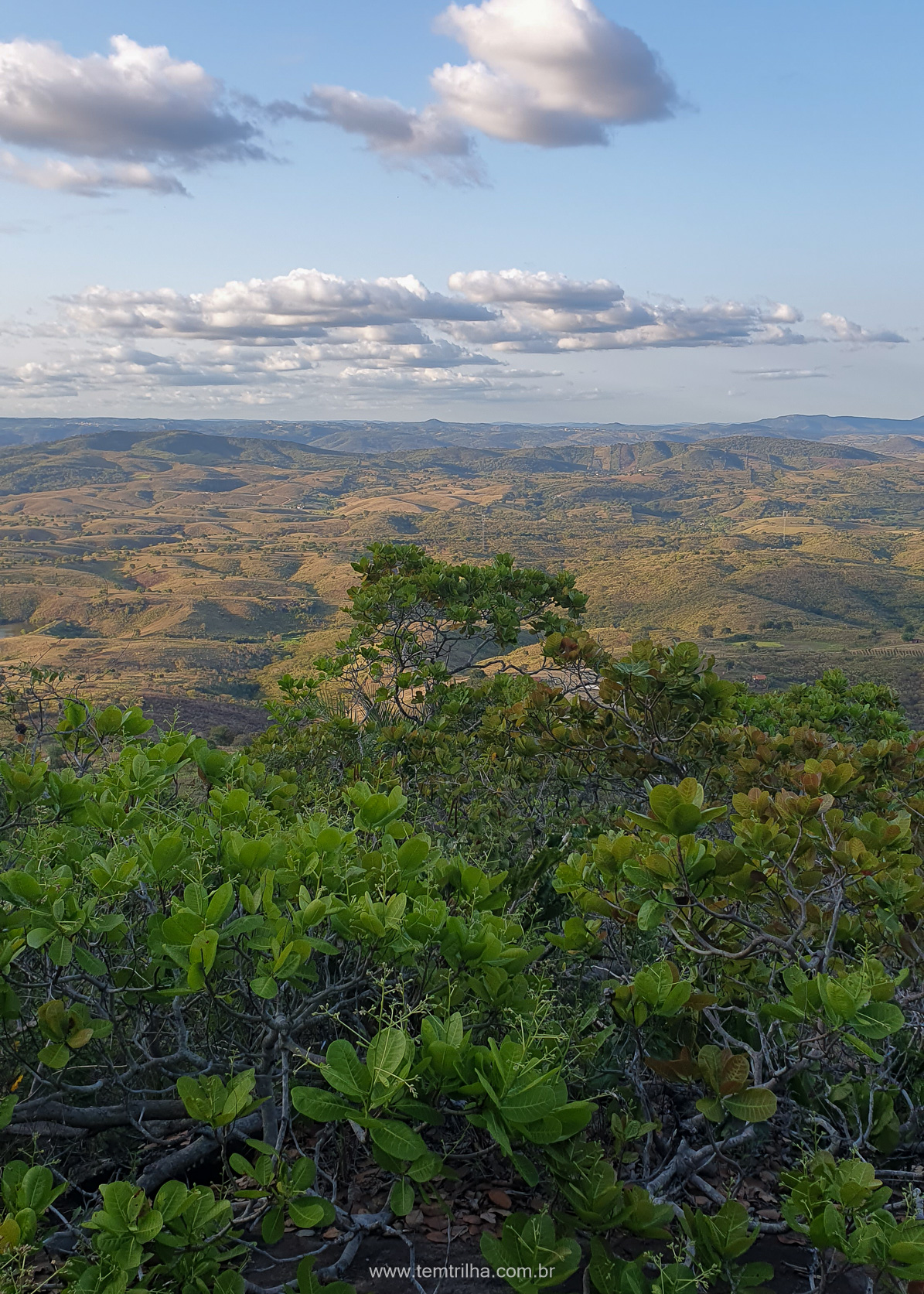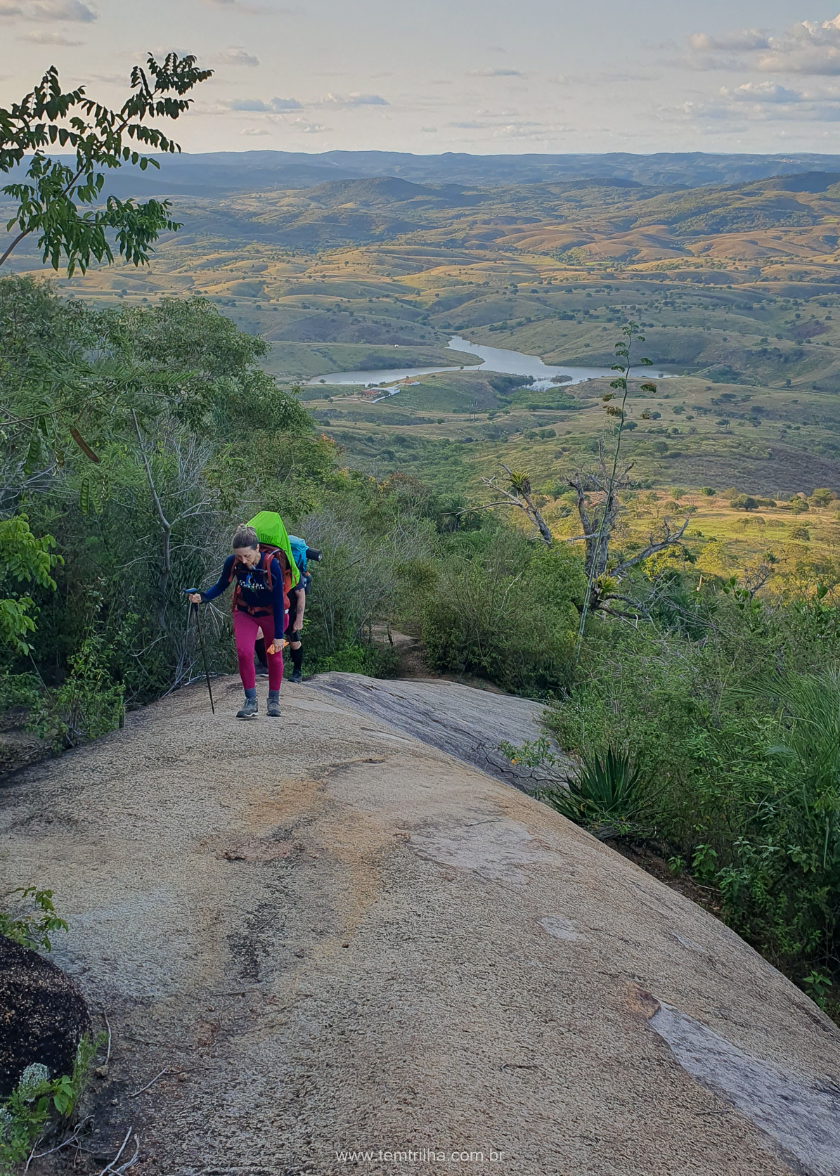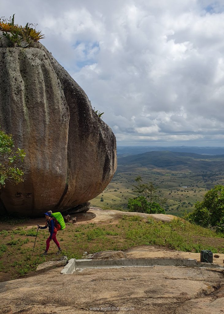 É possível apreciar a vista do complexo de serras, através da junção da Serra Velha e da Serra da Catuama, formando uma verdadeira cordilheira. Embaixo, tente localizar os picos por onde o trekking passou nos dias anteriores, como a Pedra do Urubu, a Pedra do Campo, a Pedra do Convento e a Pedra da Furna.